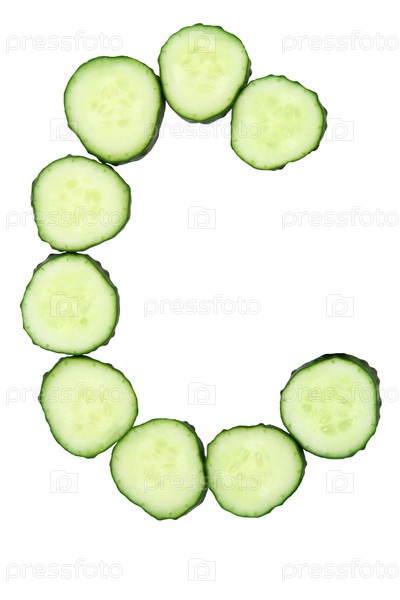 Буква С из ломтиков свежего огурца, на белом фоне