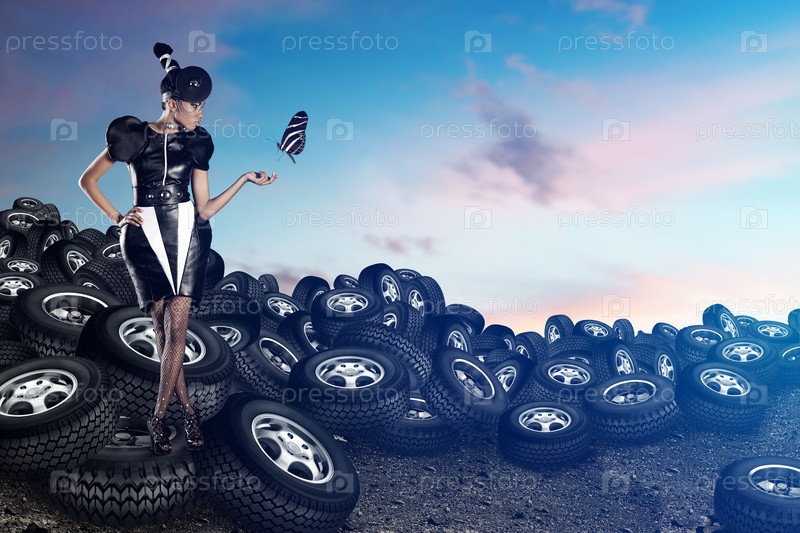 Красивая модель позирует на фоне автомобильных шин