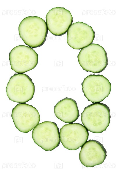 Буква Q из кусочков свежих огурцов, на белом фоне