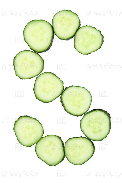 Буква S из кусочков свежих огурцов, на белом фоне