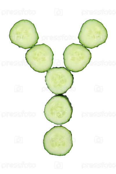 Буква Y из кусочков свежих огурцов, на белом фоне
