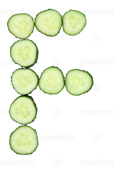 Буква F из кусочков свежих огурцов, на белом фоне