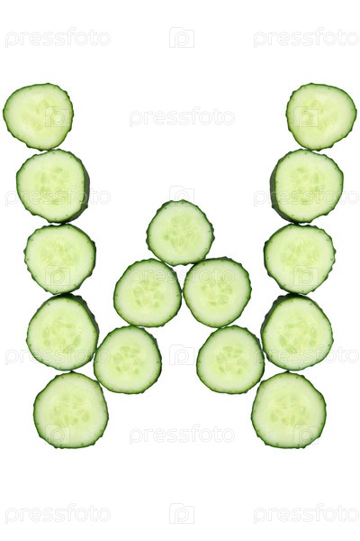 Буква W из кусочков свежих огурцов, на белом фоне