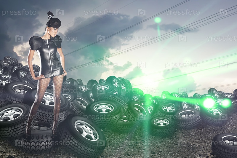 Модель позирует в автомобильных шинах