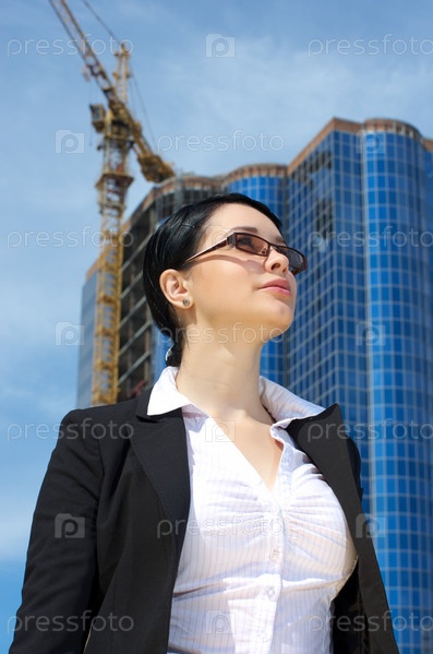 Девушка в деловом костюме на фоне строящегося здания