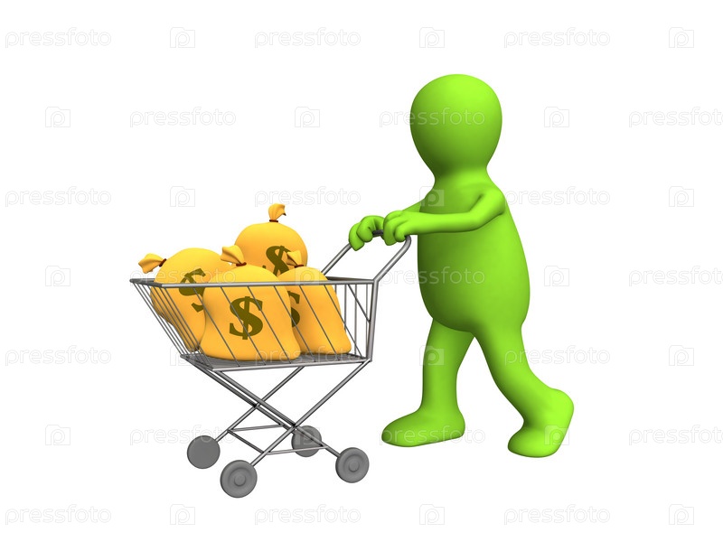 Стилизованный 3d человечек, везущий в тележке мешочки с долларами