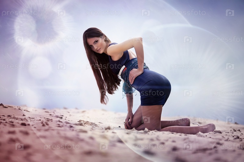 Сексуальная женщина в синем платье на пляже
