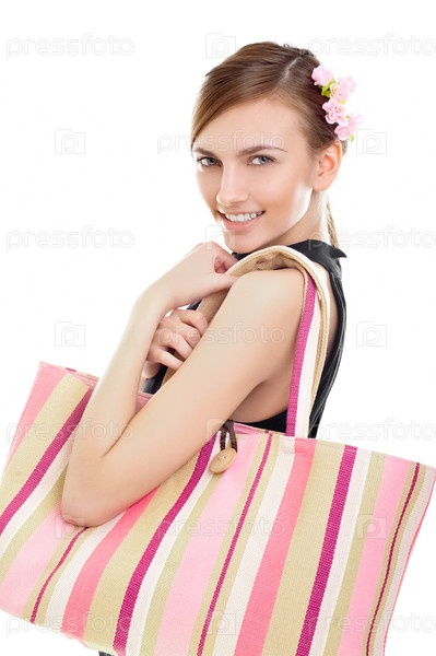 Портрет молодой женщины с полосатой сумкой. Изолирована на белом фоне
