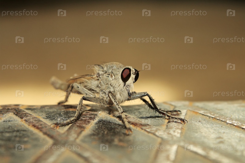 Мохнатое насекомое с большими глазами сидит на железной лестнице