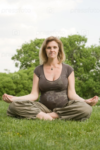 Беременная женщина сидит в позе лотоса в саду