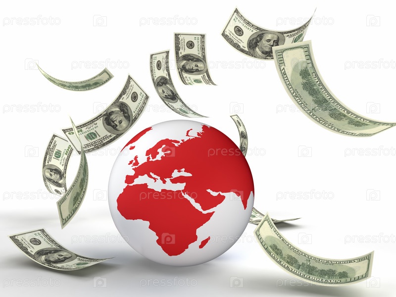 Земной шар и падающие доллары на белом фоне