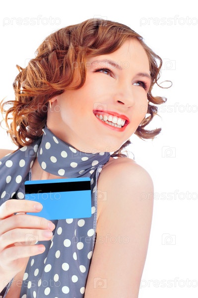 Портрет счастливой девушки с кредитной карточкой, изолирована на белом фоне
