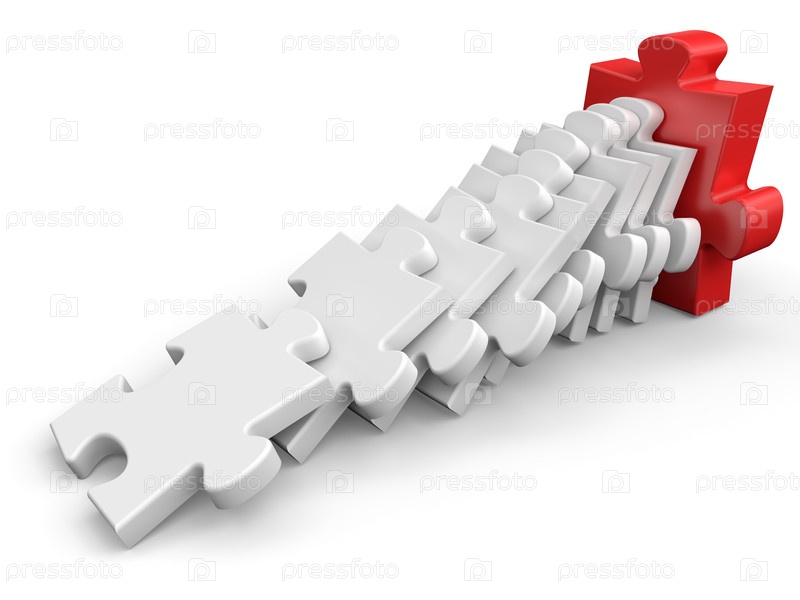 Белые пазлы упали по принципу "домино" на красный пазл на белом фоне