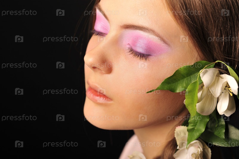 Красивая девушка с закрытыми глазами и цветком в волосах