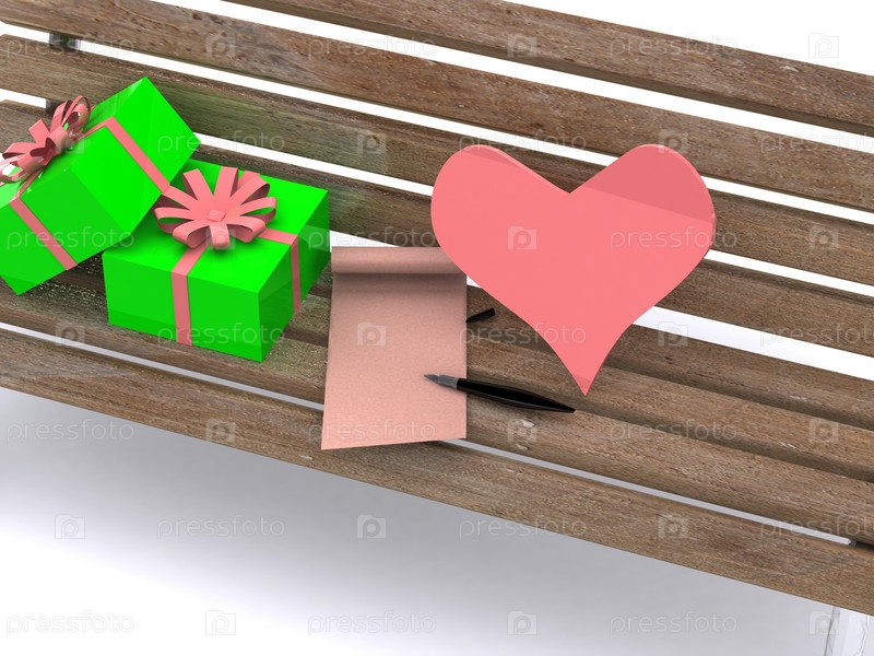 Письмо, подарки и сердце на скамейке. 3D