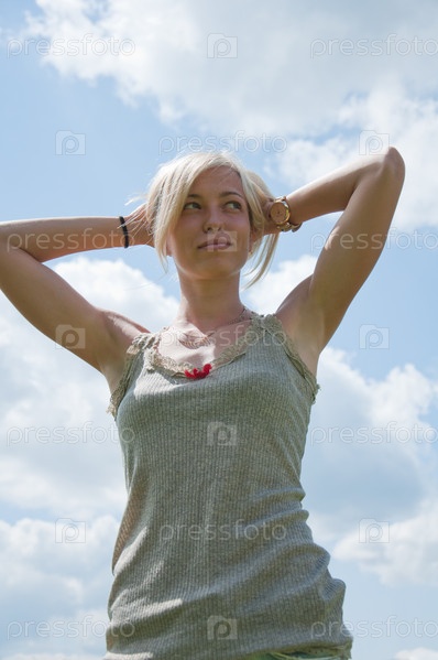 Портрет молодой красивой девушки на фоне голубого неба