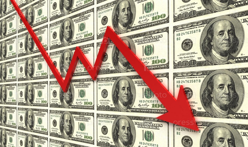График с красной стрелкой на фоне долларовых купюр