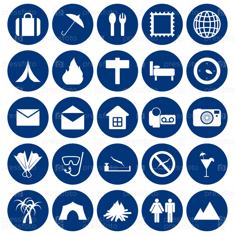 Набор синих компьютерных иконок, означающий путешествия
