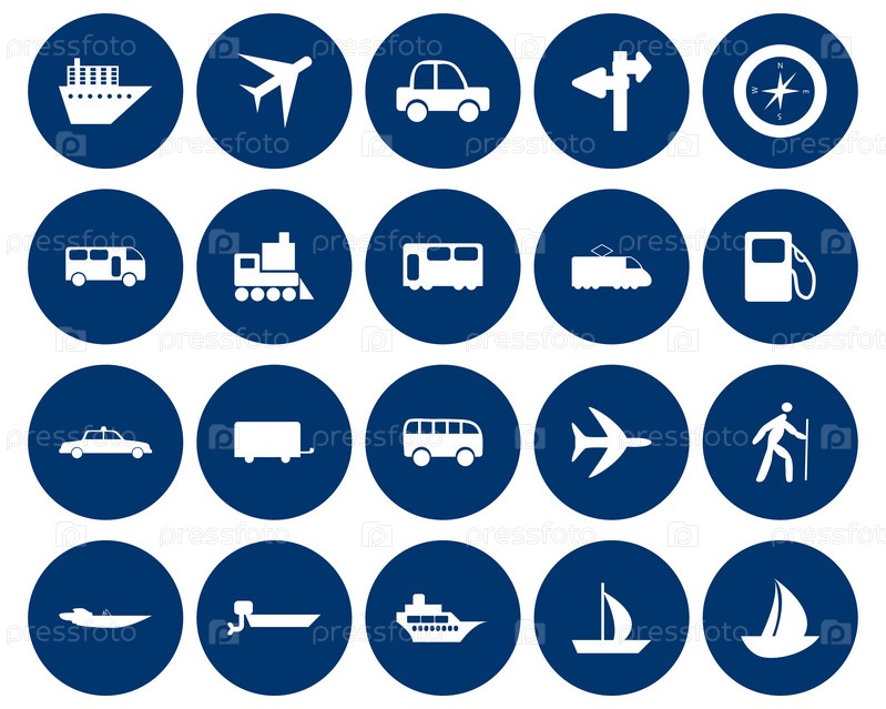 Набор синих компьютерных иконок, обозначающих виды транспорта