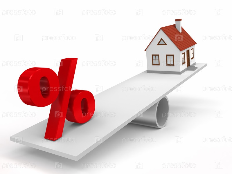Дом и знак процента на противоположных концах качели, 3D-графика на белом фоне