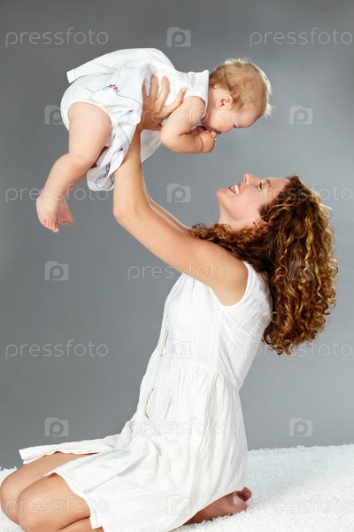 Счастливая мама с маленькой дочерью на руках на сером фоне