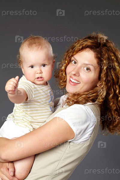Счастливая мама с маленькой дочерью на руках на сером фоне