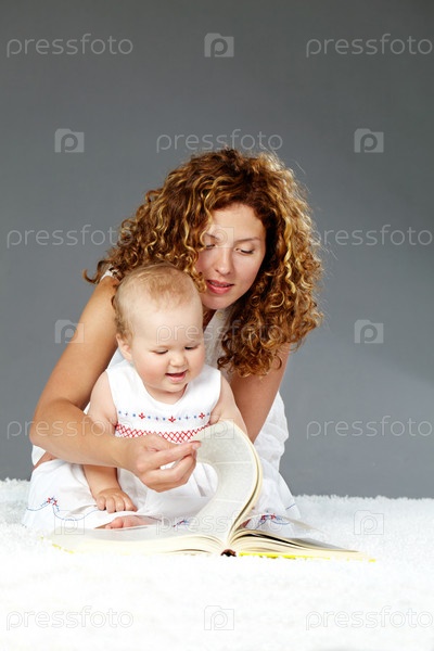 Счастливая мама с маленькой дочерью читают книжку на сером фоне