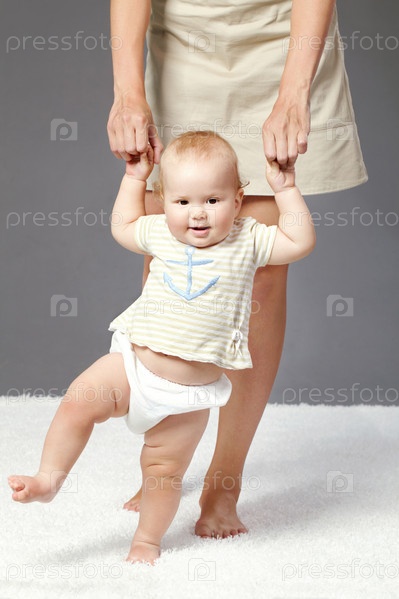 Материнские руки учат ходить маленькую дочку на сером фоне