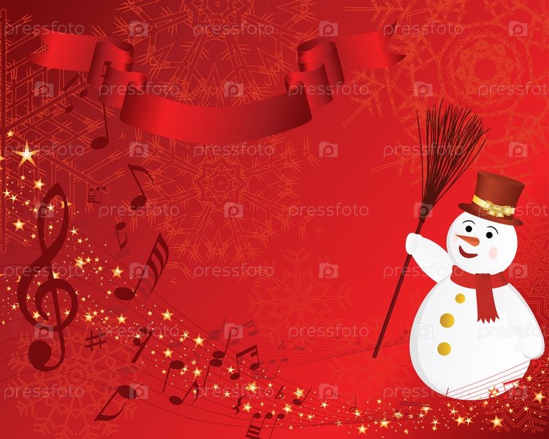 Снеговик на красном фоне с музыкальными нотами