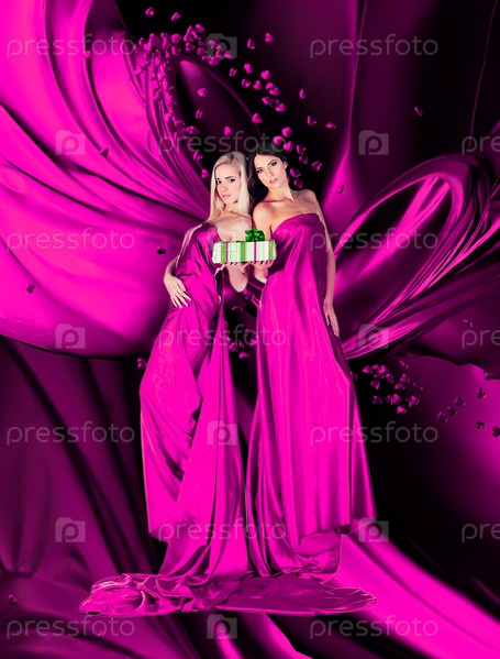 Две женщины в красных платьях с подарком