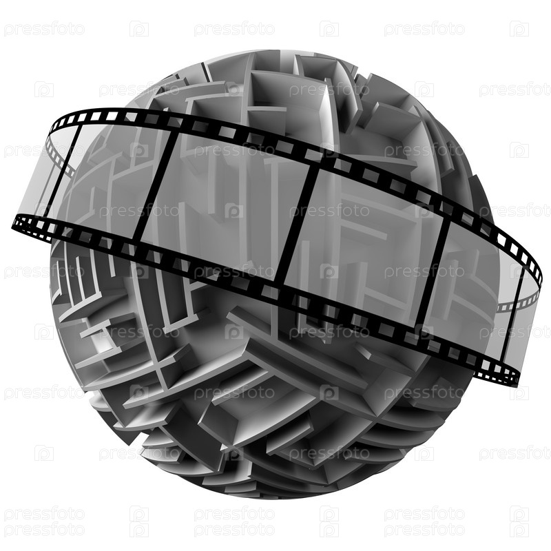 Кинопленка и лабиринт в форме шара на белом фоне