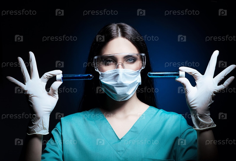 Ученый с пробирками с синей жидкостью