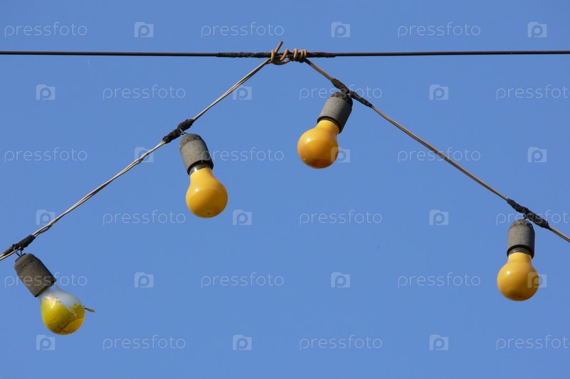 Старая гирлянда из электрических лампочек на фоне неба