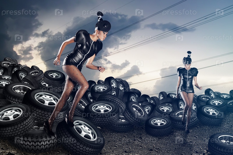 Красивая модель позирует на фоне автомобильных шин
