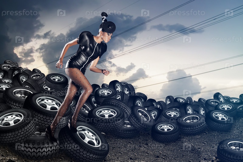 Красивая модель позирует на фоне автомобильных шин