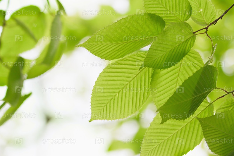 Зеленые листья крупным планом в солнечных лучах