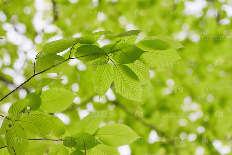 Зеленые листья крупным планом в солнечных лучах