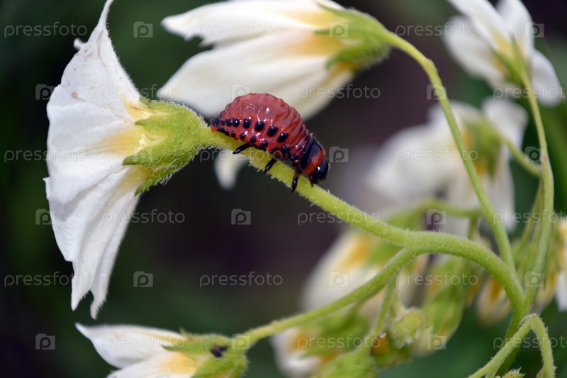 Личинка колорадского жука на цветке картофеля
