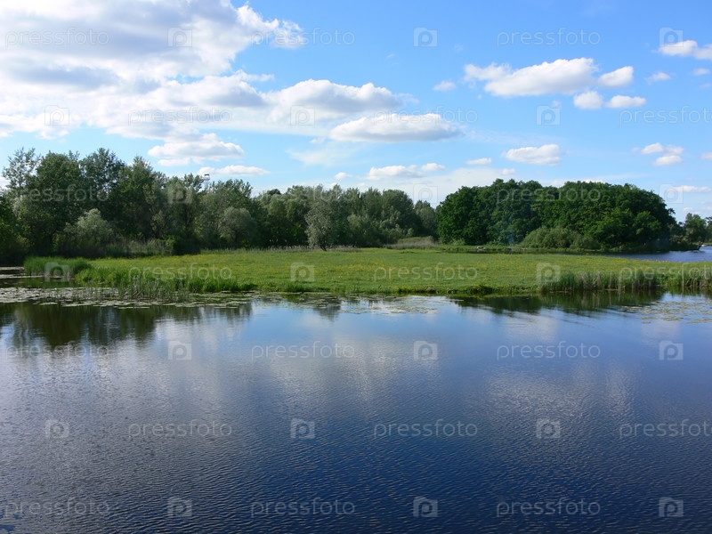 Облака отражающиеся в реке. Луг и лес на заднем плане