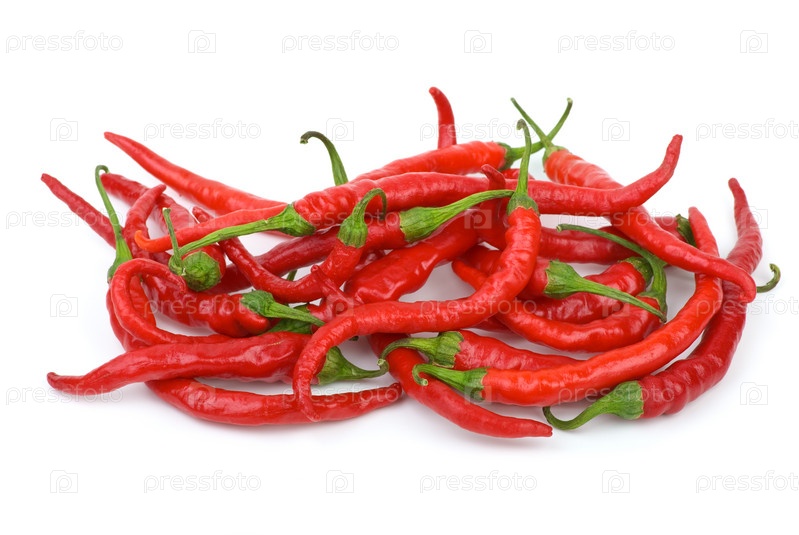 Кучка красных острых перцев на белом фоне
