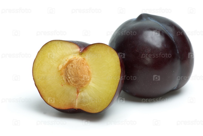 Целая слива и половинка на белом фоне