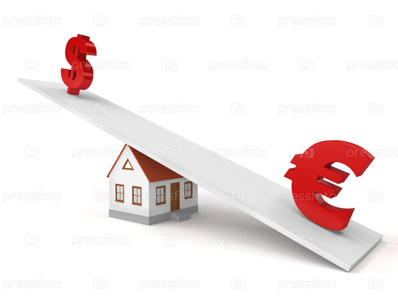 Дом и знаки доллара и евро на весах