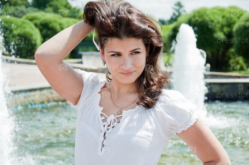 Девушка на фоне фонтана