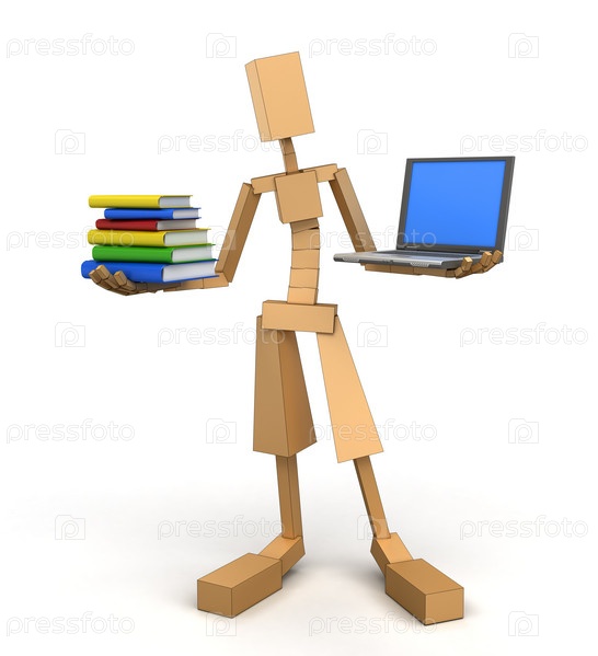 Деревянный человек с компьютером и книгами