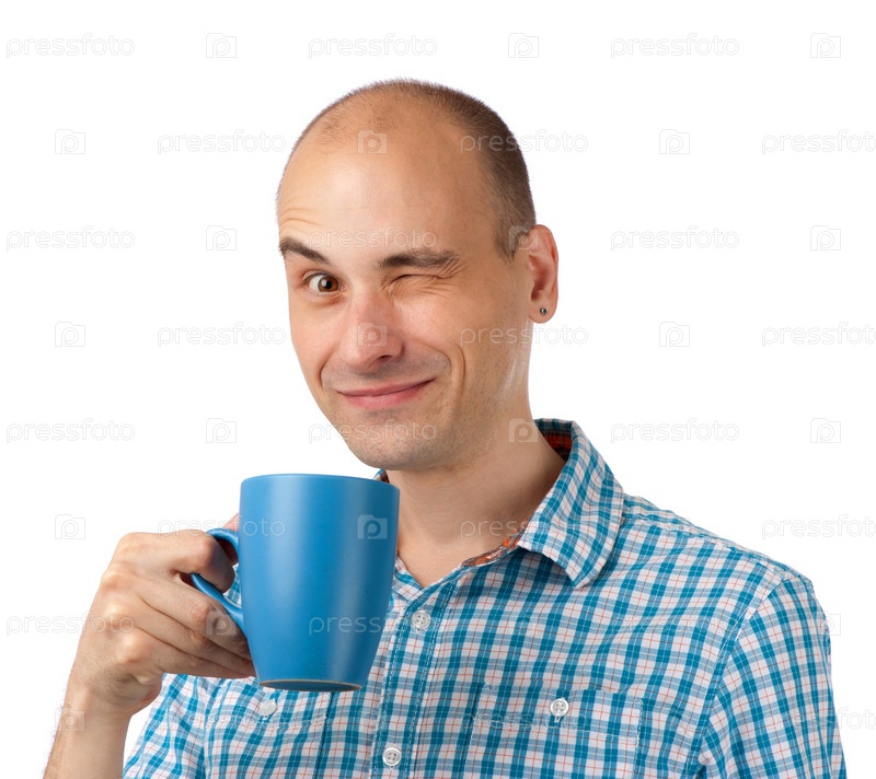 Молодой человек пьет кофе на белом фоне
