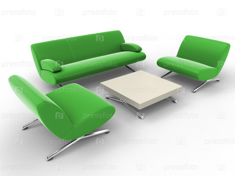 Диван, два стула и журнальный стол, 3D-иллюстрация