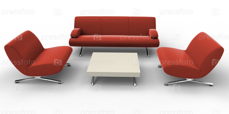 Диван, два стула и журнальный стол, 3D-иллюстрация