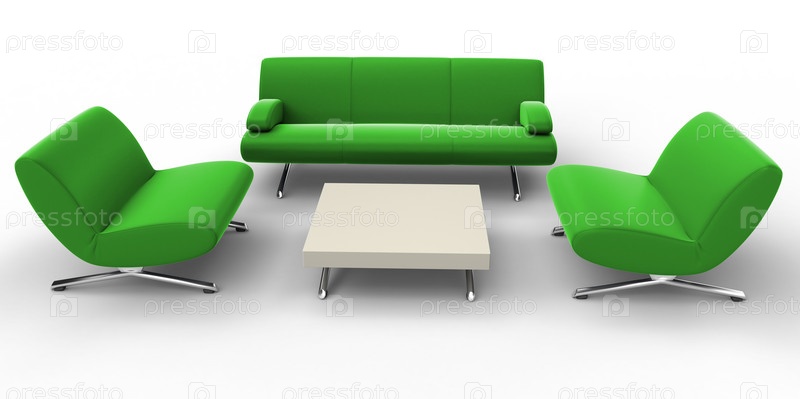 Диван, два стула и журнальный стол, 3D-иллюстрация