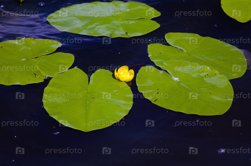 Желтый цветок кувшинки торчит из воды рядом с зеленым листом