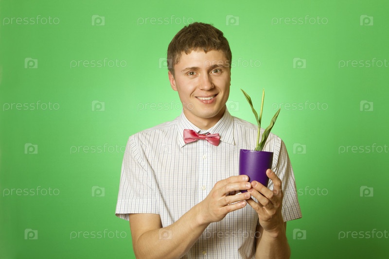 Молодой привлекательный мужчина с комнатным растением